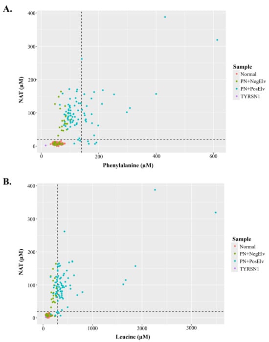 N-acetyltyrosine (NAT) bi-plots. (A,B) display bi-plots of NAT with an amino acid. In each plot, sample groups are denoted by color, as outlined in each figure legend. The horizontal line corresponds to an NAT concentration of 20 µM. (A) displays a bi-plot of NAT with phenylalanine, where the hashed vertical line represents 140 µM phenylalanine. (B) displays a bi-plot of NAT with leucine, where the hashed vertical line represents 290 µM leucine. PN+: administered total parenteral nutrition; Normal: presumptive normals (n = 120); PN+NegElv: PN+ with no elevated biomarkers (n = 42); PN+PosElv: PN+ with one or more elevated biomarkers (n = 80); TYRSN1: neonate with tyrosinemia type I (TYRSN1, OMIM 276700, n = 1).