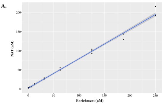 NAT quantification in our cohort of residual NBS specimens demonstrates positive clinical utility, so we validated the multiplexed method. It is important to note that in addition to NAT and NAT IS, we added direct ISs for C5:1, C10:0, and C14:1, which have historically used surrogate ISs in NBS assays. Furthermore, we created nine-level DBS NAT linearity materials, spanning from 0 to 250 µM, for use in validation (Figure 4) since none of the QC and linearity DBS materials currently manufactured by our group contain NAT. Figure 4A demonstrates that the NAT response was linear across the enriched concentrations, while Figure 4B demonstrates that NAT did not hydrolyze to Tyr in these validation materials (i.e., NAT was stable in the DBS material). The analytical validation parameters presented included precision, linearity, and the estimated limit of detection (LOD) and limit of quantification (LOQ) using the Taylor method [30], which are presented in Table 1. The concentrations of DBS QC and linearity materials are presented in Tables S1 and S2. Precision was measured by analyzing low, middle, and high DBS QCs in triplicate on 20 separate days, so the data are presented as the precision range across the three QC levels. Precision was ≤~16% for all biomarkers (Table 1). Precision data on each of the QC pools individually are presented in Table S4. Linearity was assessed by analyzing the manufactured linearity materials in triplicate on a single day, using the measured and expected concentration of each biomarker. All biomarkers analyzed in Table 1 had R2 values ≥ 0.99. Estimated LODs and LOQs were sufficient for most biomarkers, and we calculated the signal-to-noise ratio for several biomarkers that had higher-than-expected estimated LODs and LOQs, which are presented in Table S5. Since many NBS labs are already screening Tyr using IS Tyr-13C6, we also calculated NAT precision using this surrogate IS, and these similar results are presented in Table S6.