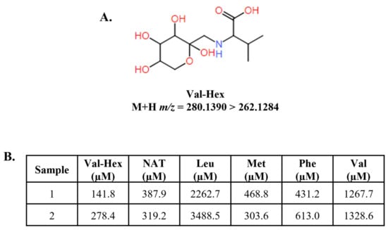 Structure, transition, and concentration of the Amadori rearrangement production (ARP) valine–hexose (Val-Hex). (A) displays the structure of the ARP Val-Hex, along with the M+H parent and product ion m/z presented as a transition. We hypothesized that ARPs would form since the parenteral nutrition administered would contain high dextrose and amino acids. Val-Hex was the most abundant ARP in our sample cohort. (B) displays the Val-Hex, NAT, and several other amino acids for two PN+PosElv neonates. These two neonates had unusual amino acid profiles that appeared similar to an improper specimen collection (i.e., IV port collection instead of a heel prick collection). Val-2H8 was used as a surrogate internal standard for Val-Hex quantification. Val-Hex data were quantified by high-resolution mass spectrometry, while other biomarkers were analyzed by triple quadrupole mass spectrometry. Figure S3A–F highlight these two neonates in the histogram of each biomarker in (B). PN+PosElv: PN+ with one or more elevated biomarkers; Leu: leucine; Met: methionine; NAT: N-acetyltyrosine; Phe: phenylalanine.