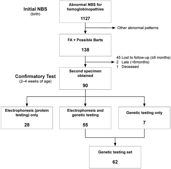 Newborns identified with possible hemoglobin (Hb) Barts on initial newborn screening. Between March 2022 and March 2024, there were 1127 abnormal initial newborn screening (NBS) tests for hemoglobinopathies. Of these, 138 had possible Hb Barts on the initial screen. The formation of the genetic testing set is shown.