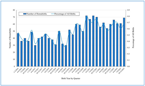 During the years 2016–2023, there were 290,458 livebirths in the JD; of these, 1623 were planned homebirths (a mean annual incidence rate of 0.56%). The number of homebirths has increased since 2020 with the COVID-19 pandemic. During the years 2016–2019, 639 homebirths were reported, while 984 were reported during the years 2020–2023 (a 54% rise in the numbers of homebirths). The mean homebirth incidence rate increased from 0.45% during 2016–2019 to 0.66% during 2020–2023, an increase of 46.7% in rates (RR = 1.47, 95%CI 1.33–1.63, p < 0.0001). Figure 1 shows the quarterly numbers of homebirths in the district (32 quarters) and the trends of the fraction of all of the district’s livebirths.