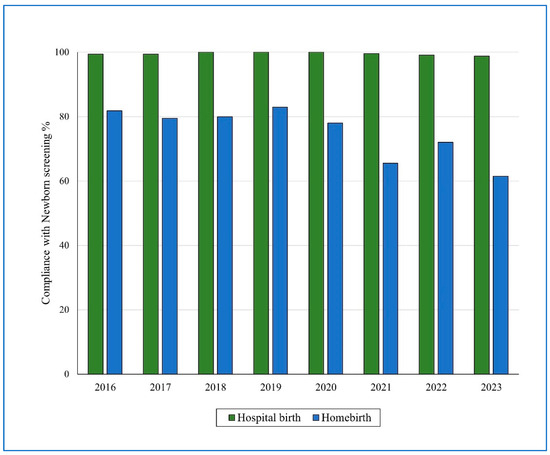The overall newborn screening rate was significantly lower in the homebirth infant group compared to the group of hospital birth infants. Of all the 3246 infants included in the study, 2809 infants underwent NBS. Among the cases, 73.6% (1194/1326) underwent NBS and among the controls 99.5% (1615/1623). While the vast majority of hospital birth infants underwent NBS, over a quarter of homebirth infants showed non-uptake (RR = 1.35 95%CI 1.3–1.39, p = 0.0001). NBS coverage rates among the homebirth infants declined significantly over time, from 81.1% during the years 2016–2019 to 68.7% during the years 2020–2023 (RR = 1.18 95%CI 1.12–1.25, p = 0.0001). In comparison, the NBS rates among the hospital birth infants declined slightly from 99.7% (in 2016–2019) to 99.4% (in 2020–2023). The lowest NBS rates were observed in 2023 (the last year of the study), 98.8% among hospital birth infants and 61.5% among homebirth infants. The annual rates of NBS uptake in the two study groups, homebirth infant group compared hospital birth infants, are presented in Figure 2.