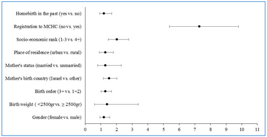 A multivariate regression analysis model was utilized to evaluate the maternal and child characteristics associated with NBS performance among the planned homebirth infants. The final model indicated that child birth order, mother’s birth country and socioeconomic status were significantly associated with NBS. Registration to the MCHC was strongly associated with the uptake of NBS (Figure 3).