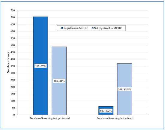 The association between the uptake of NBS and the MCHC registration in the homebirth infant group was assessed (Figure 4). The homebirth infants who did not undergo NBS were also significantly less likely to be registered to the MCHC compared to the homebirth infants who had undergone NBS (14.2% vs. 59% MCHC registration, RR = 4.15, 95%CI 3.3–5.3, p = 0.001).