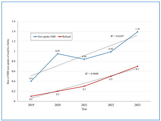 Aiming for additional assessment, we also extracted summarized data from the National NBS program annual reports, including all hospital births in the country. During the years 2019–2023, the overall primary rate of NBS non-uptake was 0.92% nationally (8297 infants of 906,749). After the comprehensive outreach process performed by the community public health teams, the overall NBS non-uptake rate declined significantly to an 0.4% of all infants (RR =2.5, 95%CI 2.37–2.56, p = 0.0001). Notably, the rates of NBS non-uptake nationally increased considerably between the years 2019 and 2023. Figure 5 shows the rising trend of non-uptake and refusal regarding NBS nationally over the years 2019–2023, the reduction in NBS non-uptake after the comprehensive outreach process and the two linear regression lines (r2 = 0.81 and 0.96, respectively).