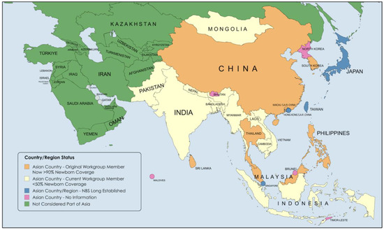 Newborn bloodspot screening (NBS) is a well-recognized public health prevention program that exists in most high-income (HIC) and many upper middle-income (UMIC) countries with more developed economies and many low- and low middle-income countries (LICs and LMICs) with developing or depressed economies [1,2]. The use of bloodspot specimens to screen newborns for phenylketonuria (PKU) was pioneered by Guthrie, who first reported their use in 1959 [3]. He reported an analysis of the first screening specimens transported to his laboratory from nearby hospitals beginning in 1962 as “the beginning of NBS”, with formal introduction of NBS as part of the state public health efforts occurring a year later [4]. While most US states had established NBS programs by the end of the 1960s, bloodspot screening programs had only begun in a few locations in the Asia Pacific region—Australia, Japan, and New Zealand [5]. Over the years, other NBS programs have been initiated in the region, and reviews/summaries of their progress have been published [1,5,6].