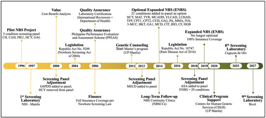- Padilla, C.D.; Abadingo, M.E.; Munda, K.V.; Therrell, B.L. Overcoming challenges in sustaining newborn screening in low-middle-income countries: The Philippine newborn screening system. Rare Dis. Orphan Drugs J. 2023, 2, 27. [Google Scholar] [CrossRef]