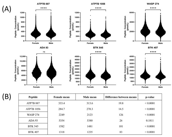 (A) Peptide concentrations between genders (male/female) (**** = p ≤ 0.0001, ns = no significance). (B) Mean peptide concentrations between genders, differences between the means and significance.