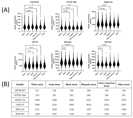 There were statistically significant differences found in peptide concentrations between white and black ethnic groups (ATP7B887, ATP7B 1056, WASP 274, ADA93), white and Hispanic ethnic groups (ATP7B 887, ATP7B 1056, WASP 274, ADA 93, BTK 545, and BTK 407), white and Native American ethnic groups (ATP7B 887, ATP7B 1056, and ADA93), and white and Asian ethnic groups (BTK 545 and BTK407) (Figure 3A,B).