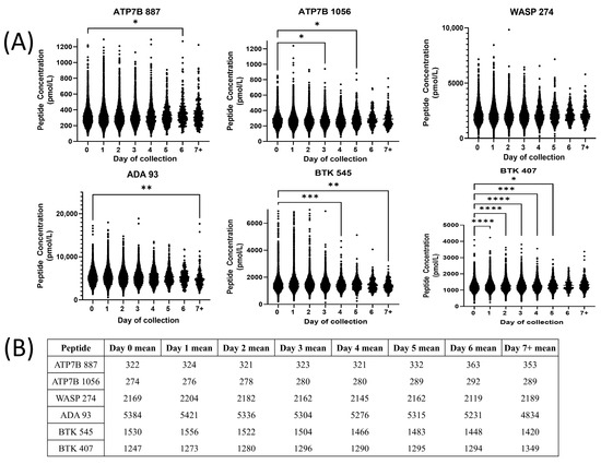 The distribution of peptide concentration from 0 to 7+ days of collection is shown in Figure 4A. WASP 274 had no significant differences between peptide concentrations for any day of collection. ATP7B 887 had statistically significant differences in peptide concentration between days 0 and 6. ATP7B 1056 had significant differences between days 0 and 3, as well as days 0 and 5. ADA 93 showed significant differences between peptide concentrations for day 0 and days 7+. BTK 545 showed significant differences between days 0 and 4, and days 0 and 7+. BTK 407 showed significant differences between days 0 and 1, days 0 and 2, days 0 and 3, days 0 and 4, and days 0 and 5 (Figure 4B).