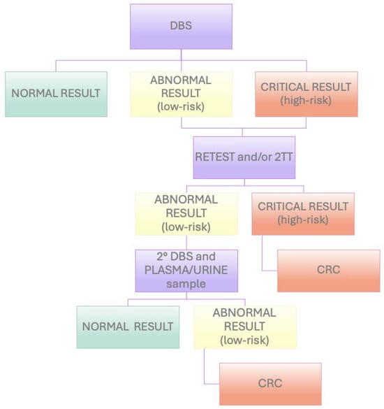 The low-risk newborns with abnormal biochemical results were subjected to a retest/2TT on the same DBS, and if the alteration was confirmed, they were recalled for the performing of a second DBS (and/or plasma or urine test) within 7 days. If the altered result persisted in the second sample, the neonate was referred to CRCs (Figure 1).