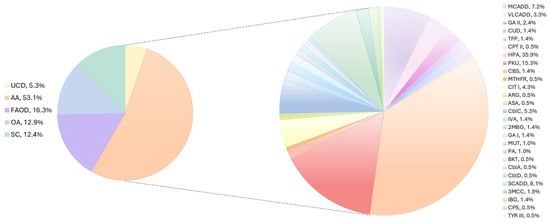 Out of 44 IEMs of the NBS panel, 27 types were diagnosed in the total of 209 patients: 111 newborns (53.1%) were affected by AAs, 11 (5.3%) by UCDs, 27 (12.9%) by OAs, 34 (16.3%) by FAODs, and 26 (12.4%) by SCs (Figure 2).