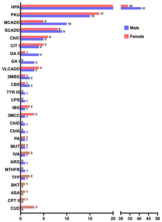 Although the total distribution of IEMs showed no differences between affected males and females (110/209 males, 53%; 99/209 females, 47%), when analyzing the IEMs individually, medium-chain acyl-CoA dehydrogenase deficiency (MCADD) was found to be two times more frequent in males than females in our cohort (Figure 3).