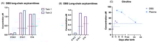 Exemplificative false positive cases. DBS biochemical results of the following: (A) acylcarnitines of two twins not mutated in ACADVL gene; (B) acylcarnitines of a newborn with a VUS having 25% of enzymatic activity; (C) DBS (violet) and plasma (blue) levels of citrulline in a newborn with negative genetic analysis. Dotted lines: 99° percentile cut-off referred for each marker.
