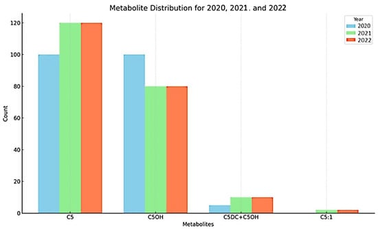 The yearly distribution of metabolites in 2020, 2021, and 2022, as shown in Figure 1, reveals distinct patterns across the three years. In 2020 (light blue bars), metabolites C5 and C5OH exhibited the highest occurrence, with both present at approximately equal levels. In 2021 (green bars), the distribution shifted. While C5 remained prominent with an increased level, C5OH showed a decrease compared to 2020. Notably, metabolites C5DC + C6OH and C5:1, which had very low or negligible presence in 2020, were detected, indicating an increase in metabolite diversity. By 2022 (red bars), C5 continued to be the most frequently occurring metabolite. C5OH remained at a lower level than C5, and C5DC + C6OH was detected at a low level. Overall, the figure illustrates that C5 and C5OH were the primary metabolites detected across the three years. C5 consistently exhibited a high presence, increasing from 2020 to 2022. While C5OH was also high in 2020, its levels decreased in subsequent years. Additionally, the presence of C5DC + C6OH and C5:1 increased over the period, although their overall levels were considerably lower than C5 and C5OH. These patterns suggest a dynamic change in metabolite profiles from 2020 to 2022.