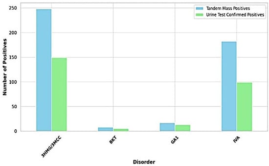 Analysis of the screening tests revealed a significant discrepancy in the number of false positives across various disorders when comparing MS/MS results and urine organic acid confirmations. 3-Hydroxy-3-Methylglutaraciduria (3HMG)/3MCC showed the highest number of false positives (99), indicating potential over detection by MS/MS. The IVA also had a substantial number of false positives, totaling 83. Fewer discrepancies were observed in Glutaric Aciduria Type 1 (GA1) and BKT, with four and three false positives, respectively, suggesting better alignment between the testing methods for these disorders (Table 1).