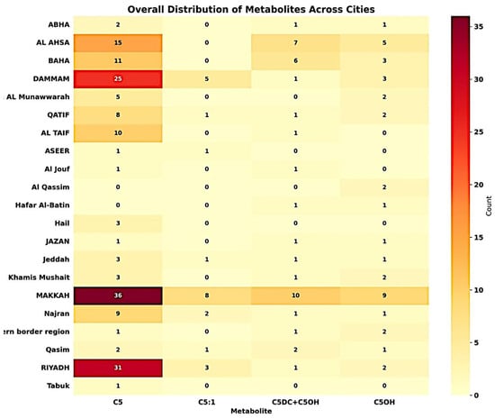 The heatmap visualization (Figure 3) outlines the distribution and frequency of various metabolites across multiple cities within this study’s dataset. Notably, cities like Jazan and AL Hassa show a higher frequency of metabolites such as C5OH, while Riyadh is characterized by a significant occurrence of both C5OH and C5. The intense shading in the heatmap for these metabolites in these cities suggests high concentrations or repeated detection over the surveyed period from 2020 to 2022 within the analyzed samples.
