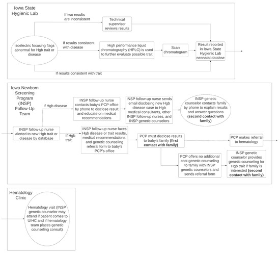 Existing resources thus suggest great variability in NBS workflows and highlight the need to fill our knowledge gap around current practice. While exhaustive documentation of all state programs was not feasible in this study, high-level analysis of diverse NBS programs can help to characterize salient program features to guide future informatics interventions in designing novel tools to support the return of results, patient education, and follow-up. Important factors that are not clearly available in the existing studies include questions such as the following: In a given NBS program, is the parent notified of NBS results by the lab, a specialist, their primary care provider (PCP), or some other party? Are they notified over the phone, by letter, or some other channel? How does the program communicate with the PCP or specialist? To provide a starting point for designing tools to improve patient experience, this study sought to characterize the existing workflows used in diverse U.S. NBS programs, focusing on the common use case of hemoglobinopathies.