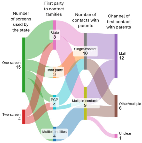 A Sankey diagram showing number of states with key features that would impact implementation of informatics-supported NBS follow-up tool using four questions: How many screens does the state perform? Which party makes the first contact with parents? How many times is contact attempted with a parent by any party for NBS return of results? And what is the first communication channel used by any party to contact parents for NBS return of results?