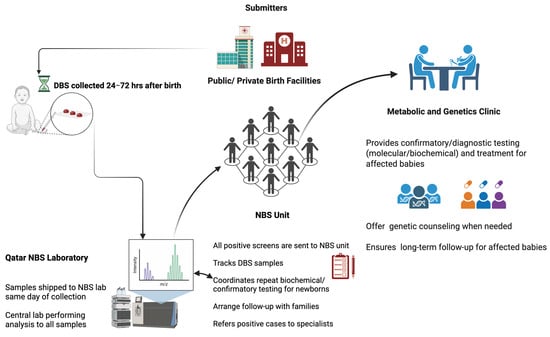 In Qatar, NBS is not mandated but is universally offered to all newborns free of charge as a standard of care, with a coverage of 98% []. The design of our screening program promotes seamless pre-analytical, analytical, and post-analytical processes (see Figure 1). Similarly to other programs, the program encompasses the screening lab, the NBS unit, and the treatment team. Screening results are reported to the NBS unit for retrieval and short-term follow-up and parental education. This is followed by diagnostic testing, patient management, treatment monitoring, and genetic counseling at the metabolic and genetics clinic.