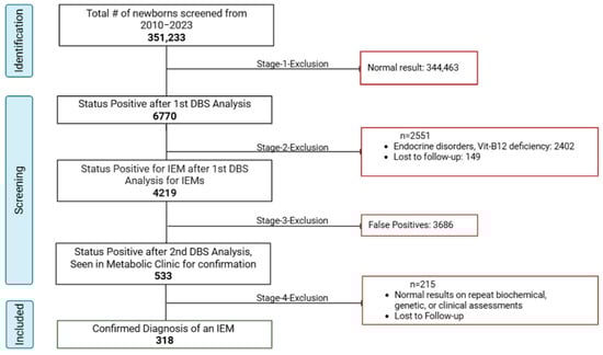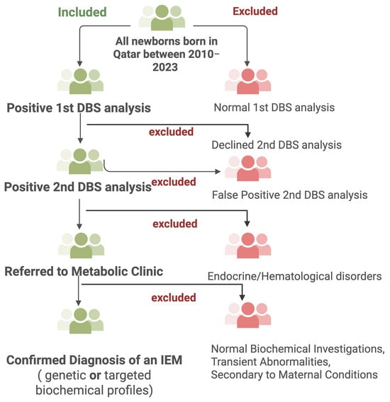 This retrospective cohort study was conducted at the NBS unit in the Women Wellness and Research Center (WWRC) and the Metabolic and Clinical Genetics Department at HMC in Qatar. The project was approved by the Medical Research Center at Hamad medical Corporation (HMC) and by the WWRC under the protocol number MRC-01-23-580. Additionally, it was approved by the Institutional Review Board (IRB) of Qatar University under the reference number QU-IRB 010/2024-E. The study involved a filtration process and chart review of newborns who had undergone NBS and were biochemically suspected of having an IEM between 2010 and 2023, using HMC electronic medical records and data from the QNNSP. Figure 2 summarizes the screening workflow, including inclusion and exclusion criteria, as well as the steps leading to a confirmed diagnosis of IEMs.
