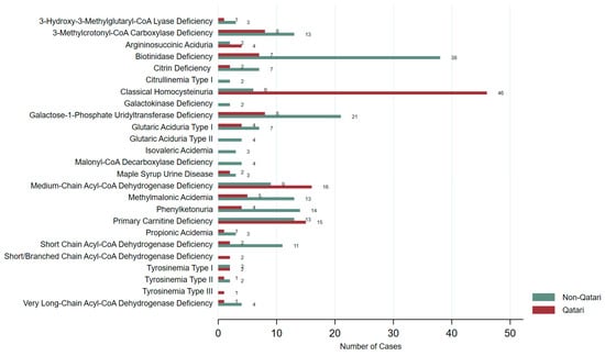 The distribution of identified IEMs also varied between groups (Figure 5). Classical Homocystinuria (HCU) and Medium-Chain Acyl-CoA Dehydrogenase Deficiency (MCAD) were more prevalent among Qataris, while Biotinidase deficiency, Galactose-1-Phosphate Uridylyltransferase (GALT) Deficiency, Phenylketonuria (PKU), and Short-Chain Acyl-CoA Dehydrogenase Deficiency (SCAD) were more frequently reported in non-Qataris. Figure S2 illustrates the distribution of IEMs across different ethnic groups, highlighting variation in disorder types among Qatar’s diverse population.