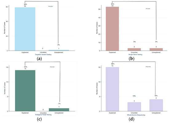 Diagnostic yield of different genetic tests performed: (a) targeted variant testing; (b) single gene testing; (c) multi-gene panel testing; (d) whole exome sequencing.
