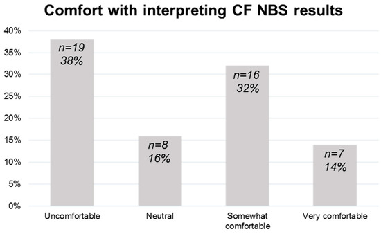 Provider comfort with Pennsylvania Cystic Fibrosis (CF) Newborn Screening (NBS) results interpretation. Comfort levels with interpreting state CF NBS reports varied. 46% of providers (n = 23) were comfortable or very comfortable with interpreting Pennsylvania CF NBS reports while 38% (n = 19) of providers were uncomfortable with the process.
