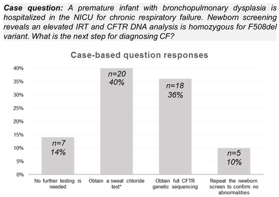 Survey responses to case-based question about diagnostic evaluation following an abnormal Pennsylvania Cystic Fibrosis (CF) Newborn Screening (NBS) result. Only 40% (n = 20/50) of respondents identified the need for confirmation of an abnormal CF NBS result (elevated immunoreactive trypsinogen (IRT) and homozygous F508del CFTR variant) with diagnostic testing (sweat chloride analysis) based on the state algorithm (correct answer denoted by an asterisk as shown).