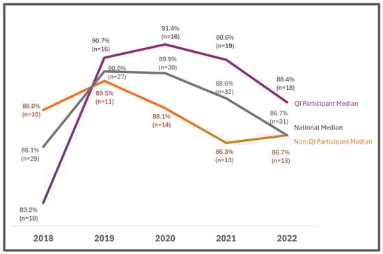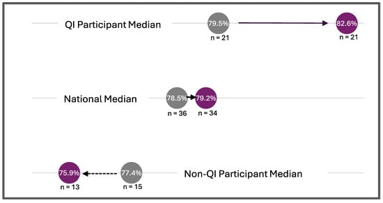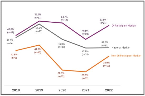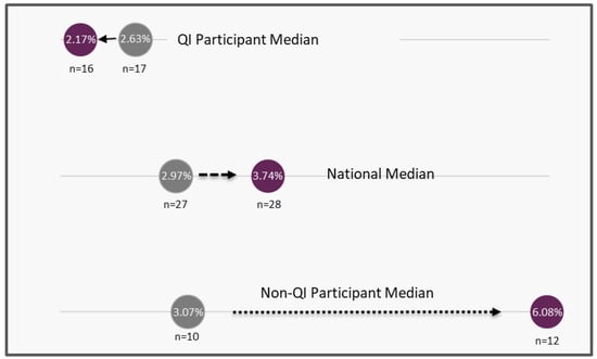Additionally, some QI projects may not have shown progress with a specific metric; however, their programs may have already been performing above the national median/benchmark for quality indicators. Conversely, other QI projects that saw improvement may have started below the national median/benchmark.