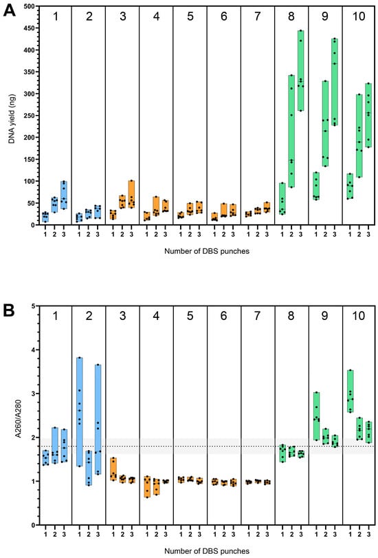 Figure 1. DNA yield and A260/A280 ratio. DBS = dried blood spot. Comparison of DNA yield (ng) (A) and A260/A280 (B) ratio between ten different DNA isolation protocols using one, two, and three DBS punches (3.2 mm). The dotted line depicts the optimal A260/A280 ratio (B) with a 10% interval around it in grey. The numbers above the columns correspond to the DNA isolation protocols as described in Table 1. The median and range for the measurements per protocol are depicted by the bars, with colors indicating different techniques used, including column-based (blue), lysis-based (orange), and magnetic bead-based (green).