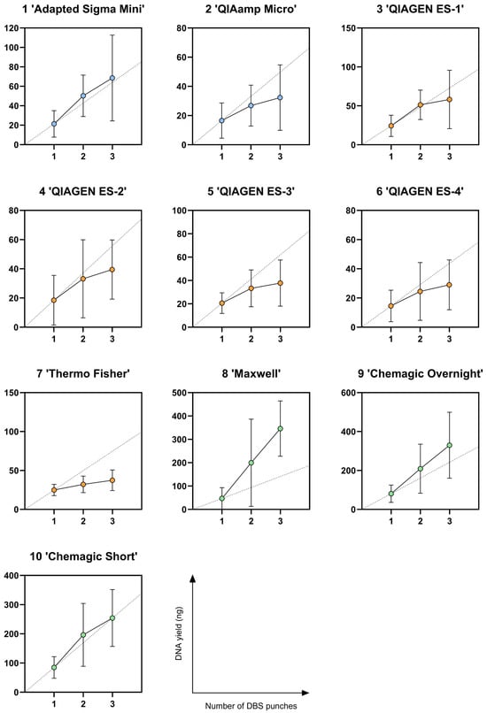 Figure 2. Mean DNA yield with increasing number of DBS punches. DBS = dried blood spot. Comparison of the mean DNA yield (ng) and 95% CI observed with increasing numbers of DBS punches (3.2 mm) used as starting material. The dotted line represents a hypothetical function if the yield from two and three DBS punches increased in direct proportion to the yield from one DBS punch. The colors indicate different techniques used, including column-based (blue), lysis-based (orange), and magnetic bead-based (green).