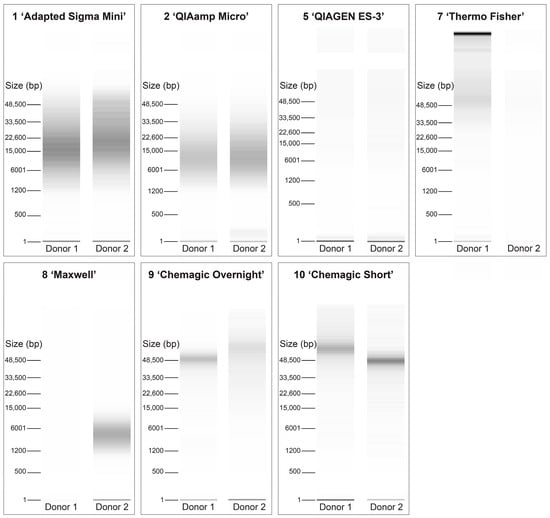 For measuring molecular weight, seven of the ten protocols were selected. The protocols included the five protocols, with both Chemagic protocol variants: protocol 1 (‘Adapted Sigma Mini’), protocol 2 (‘QIAamp Micro’), protocol 5 (‘QIAGEN ES-3’), protocol 7 (‘Thermo Fisher’), protocol 8 (‘Maxwell’), protocol 9 (‘Chemagic Overnight’), and protocol 10 (‘Chemagic Short’). Protocol 5 was selected over protocols 3, 4, and 6 due to comparable performance and lower elution volume (results 3.4). The molecular weight was measured in a diluted concentration of 0.3 ng/µL on the Femto Pulse System (Agilent Technologies, Santa Clara, CA, USA) using the Genomic DNA Analysis kit (Agilent Technologies, Santa Clara, CA, USA) with a lambda ladder (Bio-Rad Laboratories, Hercules, CA, USA). Samples were stored in the freezer at a temperature of −20 °C between measurements.