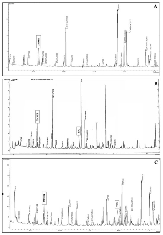 Chromatograms of urinary organic acids of the three cases showing the presence of: a peak corresponding to 2-methyl-3-hydroxybutyric acid (A); a peak corresponding to 2-methyl-3-hydroxybutyric acid and to tiglylglicine (B); a peak corresponding to 2-methyl-3-hydroxybutyric acid and to tiglylglicine (C).