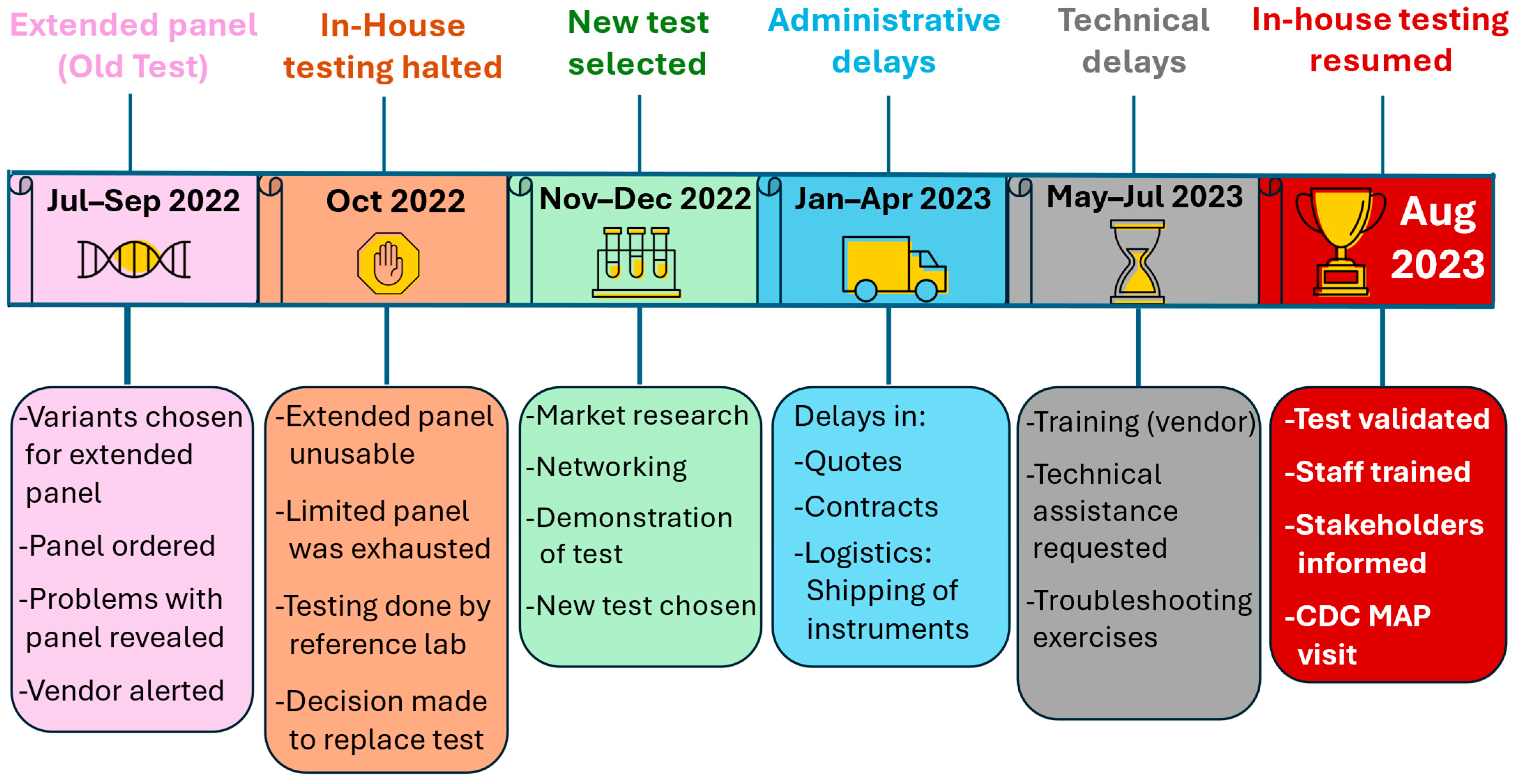 - Despite our extensive planning, test implementation was not completed within the expected timeframe due to administrative (quotes and contracts), and logistical (instrument procurement/shipment) delays and technical issues.