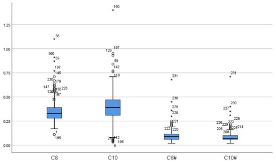 The distribution of C8 and C10. (C8: C8 in false-positive initial screening; C10: C10 in false-positive initial screening; C8#: C8 in false-positive repeat screening; C10#: C10 in false-positive repeat screening. “*” represent outliers, while “○” indicate extreme outliers).