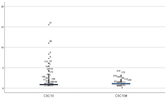 The distribution of C8/C10 ratio. (C8C10: C8/C10 in false-positive initial screening; C8C10#: C8/C10 in false-positive repeat screening. “*” represent outliers, while “○” indicate extreme outliers).