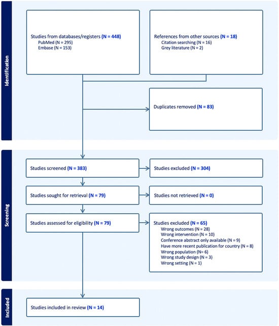 We identified 466 publications, with 448 from PubMed and Embase and 18 found through citation searching and grey literature, with 83 duplicates. No additional studies were identified by hand-searching IJNS publications. After title and abstract screening, 304 studies were excluded. We then reviewed 79 full-text articles, excluding 65 that did not meet eligibility criteria in terms of outcomes, interventions, population, or study design, or because a more detailed and recent publication for that jurisdiction was available. Ultimately, 14 publications were included in the review (Figure 1).