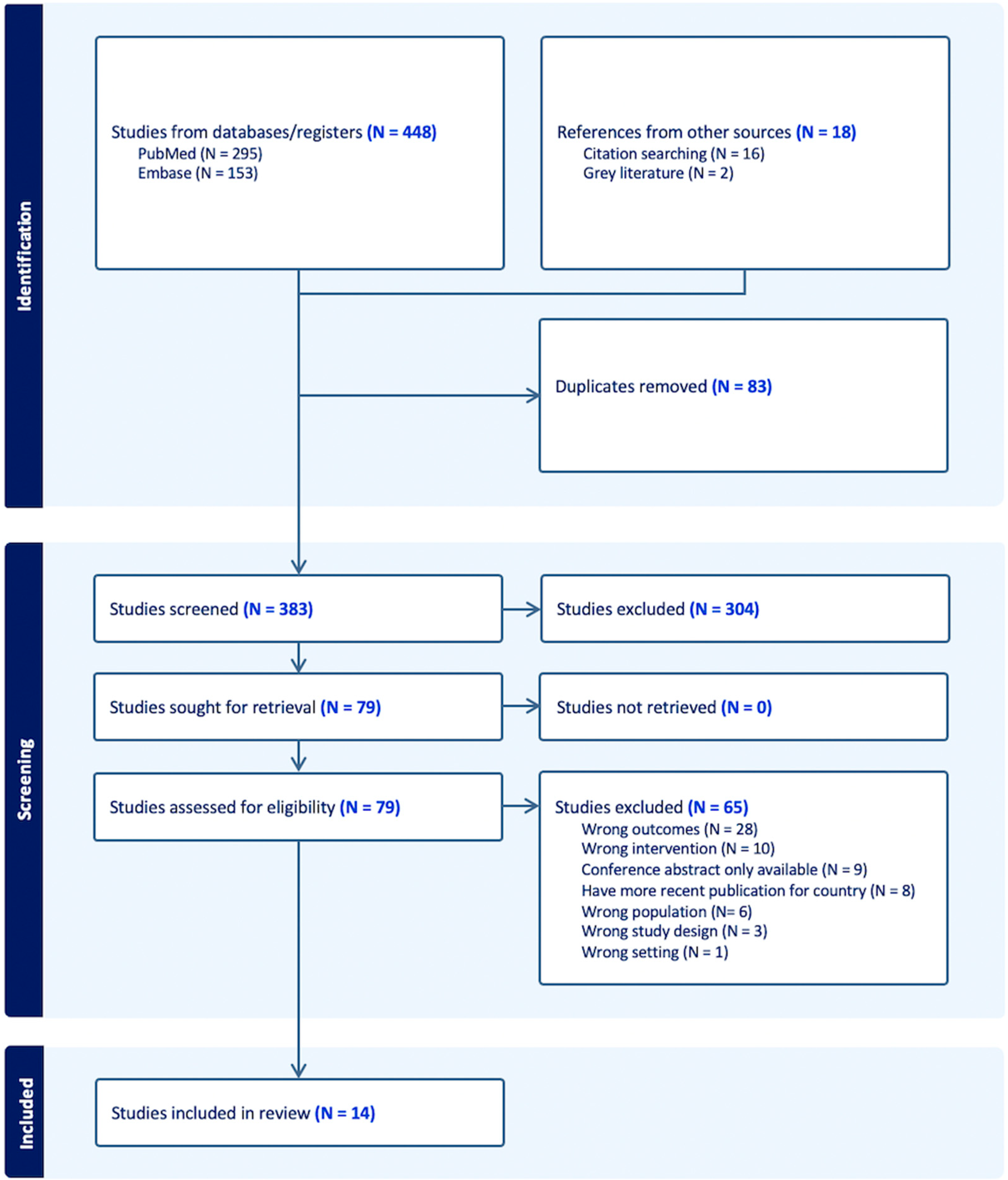- Outcome: Timeframe for implementation. There is considerable heterogeneity in how this outcome is reported across the literature. Some publications describe timeframes from the point of view of governmental or regulatory approval, or pilot study initiation, while others mention earlier preparatory and political processes. To address this transparently, we report the timing associated with specific steps as described in each publication, where available.