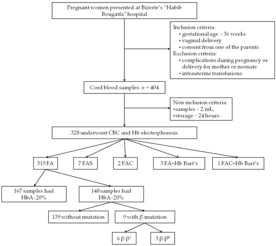 During the 22-week-period screening, 404 cord bloods were collected. A total of 76 were eliminated because they met at least one exclusion criterion (Figure 1). The 328 remaining samples underwent hematological analysis (CBC and Hb electrophoresis).
