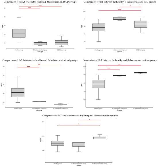 Boxplot showing significant differences in hematological parameters between groups. * p < 0.05; ** p < 0.01; *** p < 0.001.