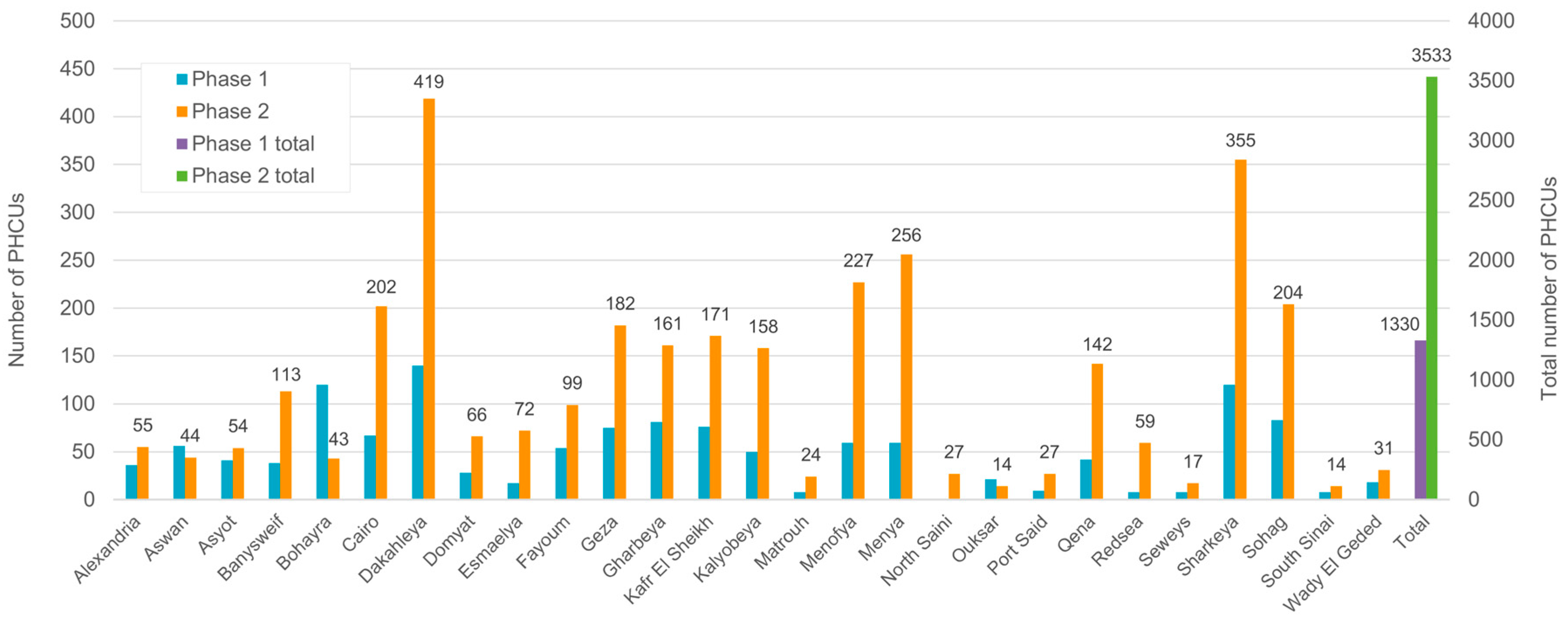 In the first phase of implementing the program (until the end of 2020), screening was performed in 1364 PHCUs. As of 2021, the number of screening centers was increased to 3500 (second phase). The PHCUs selected in the first and second phase were distributed throughout all 26 Egyptian governorates. The number of PHCUs in the different governorates performing the screening in the first and second phases, as well as the total number of PHCUs, is displayed in