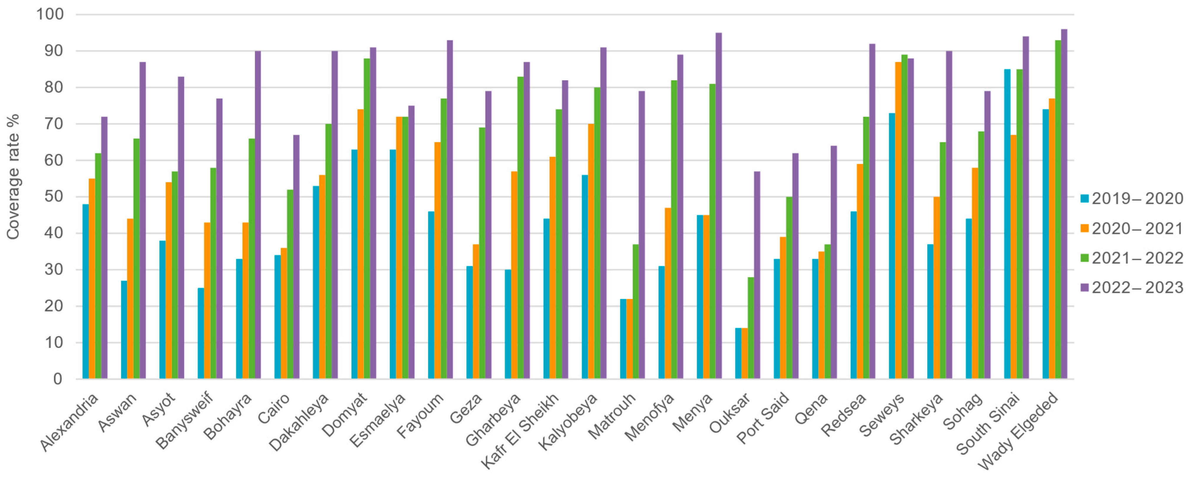 The initial coverage rate varied from 14% to 85% across the different regions and reached the benchmark of ≥95% in two regions (Menya and Wady El Geded) (