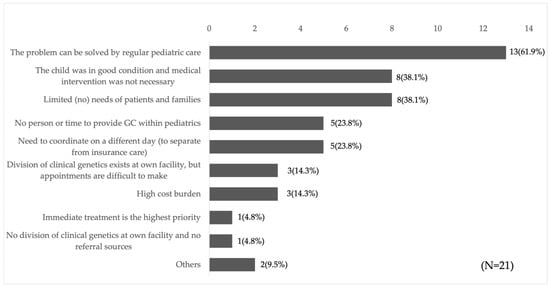 Respondents were asked to provide their opinions regarding GC for individuals who tested positive through NBS. All 46 respondents except one reported that “GC is useful for follow-up of the child (initiation and continuation of treatment)” and “useful for follow-up of the parents (consideration of future pregnancies and health care)” while one respondent stated “I am not sure about the usefulness of GC. The most frequently cited expectations for GC for individuals who screen positive through NBS were “consultation regarding future pregnancies (89.4%),” “providing and organizing genetic information (85.1%),” and “listening to patient and family anxiety and conflicts (78.7%)” (Figure S1). Conversely, 21 respondents indicated that they “sometimes do not perform GC on individuals who screen positive through NBS”. The most common reasons cited were “the problem can be addressed through regular pediatric care” (13/21, 61.9%) and “the child was in good condition and did not require medical intervention” (8/21, 38.1%). Approximately 76.2% (16/21) of respondents cited one of these two reasons (Figure 2). These findings suggest that some metabolic specialists perceived an overlap between the roles of GC and pediatric care, viewing GC as an extension of pediatric care in certain cases.