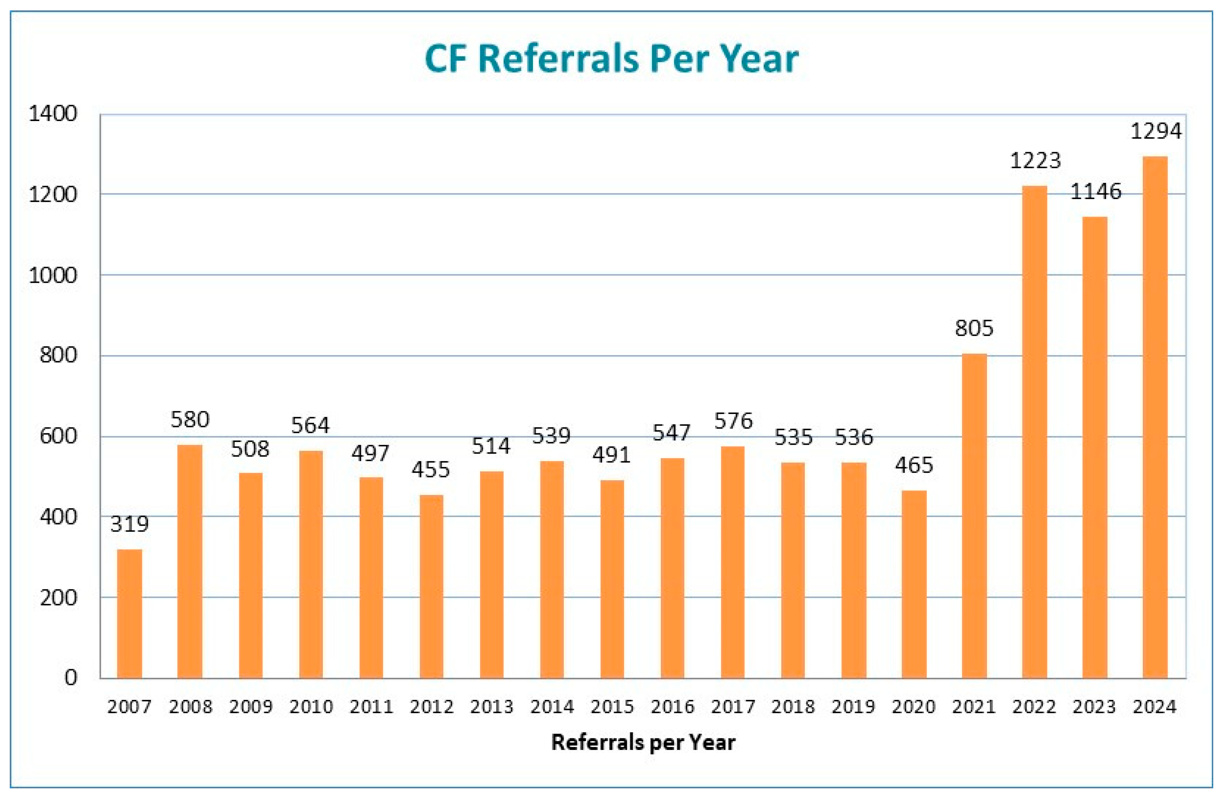 Number of Variants | 2022 CRMS Cases | 2022 Sweat Cl Classification | 2023 CRMS Cases | 2023 Sweat Cl Classification | 2024 CRMS Cases | 2024 Sweat Cl Classification |