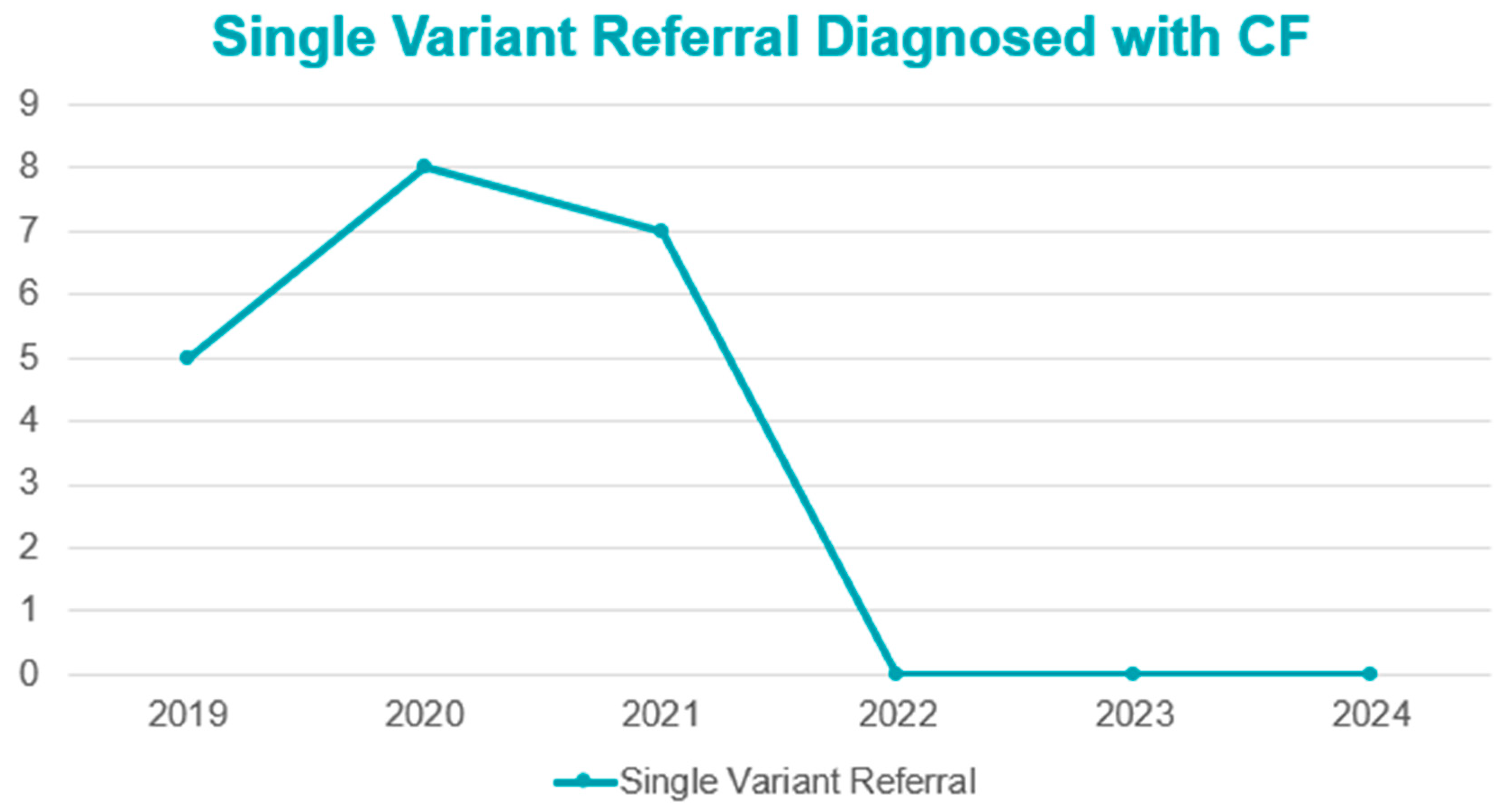 - McGarry, M.E.; Sciortino, S.; Graham, S.; Bishop, T.; Gibb, E.R. Improved detection of cystic fibrosis by the California Newborn Screening Program for all races and ethnicities. Pediatr. Pulmonol. 2024, 59, 2901–2909. [Google Scholar] [CrossRef] [PubMed]
