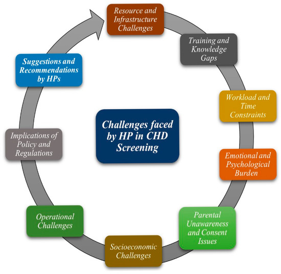 There are numerous challenges in the early screening of newborns, and a significant portion of the population in low- and middle-income countries (LMICs) lacks access to standard fetal CHD detection procedures, resulting in diagnostic delays [8]. Clinical examination alone is often insufficient, as newborns may remain asymptomatic until the closure of the ductus arteriosus and foramen ovale, completing the transition from fetal to neonatal circulation. Cyanosis may not manifest until the oxygen saturation (SpO2) drops below 80%. Murmurs, despite being a significant clinical indicator of CHD, may be absent in specific critical instances or may be misleading owing to anatomical variations, the degree of pulmonary vascular resistance, or impaired ventricular function. Furthermore, the detection of complex CHDs and subtle abnormalities persists as a challenge when relying exclusively on routine clinical examinations [9]. Pulse oximetry (POX) is a reliable, non-invasive, and easy-to-use tool for detecting critical CHDs and is widely used for screening [10]. However, limitations such as false positives or negatives due to poor technique, calibration issues, variations in accuracy at high altitudes, skin pigmentation differences, or environmental conditions can lead to significant challenges in effective screening. Professor Guoying Huang’s research group has developed a novel “dual index” screening method that integrates pulse oximetry with cardiac murmur auscultation for the early detection of CHD in neonates within 6 to 72 h after birth. So, internationally, there are POX and dual-index screening methods that have been developed [11]. The “dual-index” has not yet been utilized in Pakistan. In Pakistan, a combination of clinical examination and pulse oximetry (POX) is employed for early screening of CHD in newborns. However, are there any challenges faced in real-world activities when conducting these screenings? We reviewed several references to identify the challenges reported by healthcare professionals involved in newborn CHD screening. These include a lack of specialized equipment, inadequate training, insufficient follow-up care, limited institutional support, poor healthcare infrastructure, low family awareness, and adherence to essential care [12]. Similarly, HPs working in low- and middle-income countries such as Pakistan have highlighted the burden of heavy workloads, insufficient resources, difficulties in accessing screening equipment [13] and challenges in obtaining ECHO services. They also face issues with transportation, a high volume of home deliveries, and the absence of health records for newborns, all of which complicate the screening process [14].