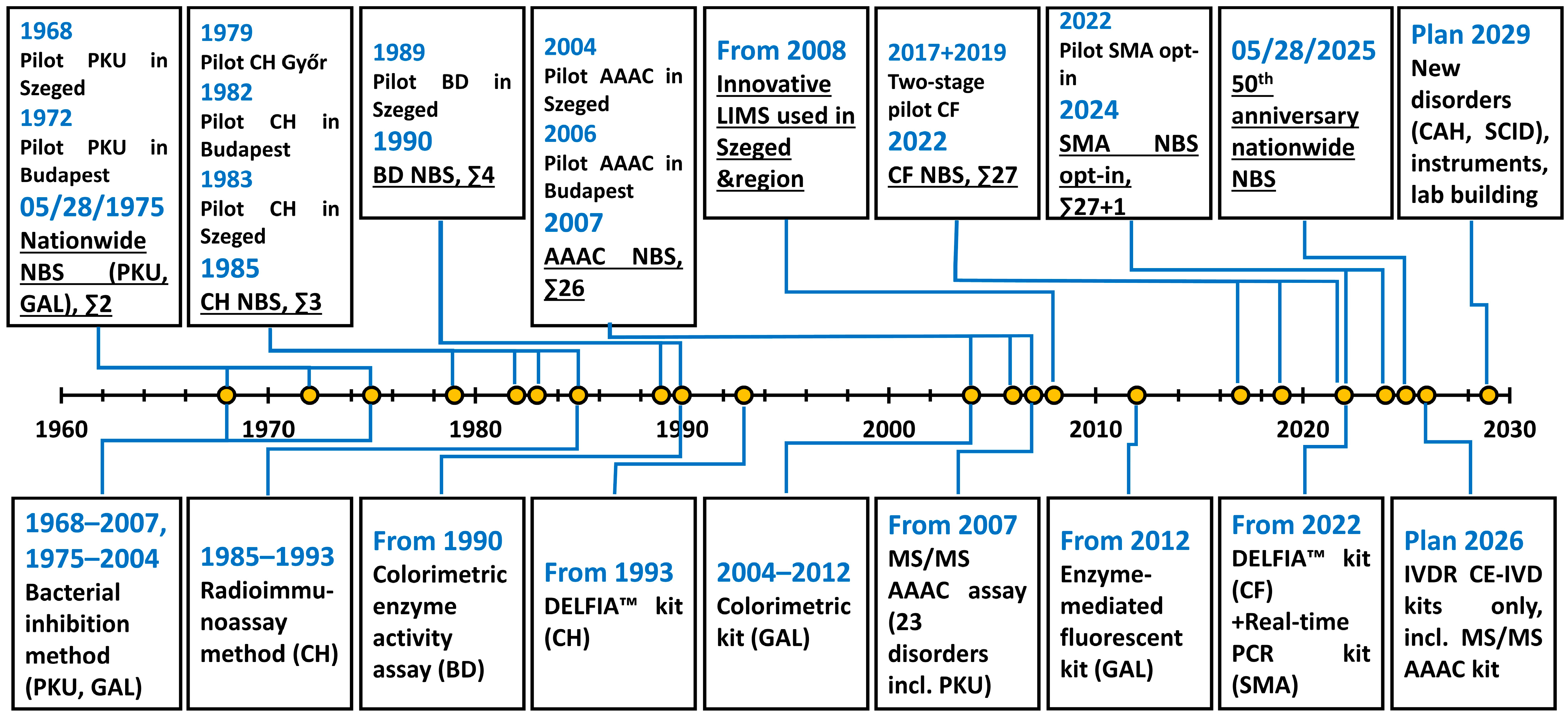 Monostori, P.; Szatmári, I.; Baráth, Á.; Bókay, J.; Csenki, M.; Galla, Z.; Gellén, B.; Grecsó, N.; Gyüre, E.; Halász, Z.; et al. Celebrating 50 Years of Nationwide Newborn Screening in Hungary—Review, Current Situation, and Future Directions. Int. J. Neonatal Screen. 2025, 11, 99. https://doi.org/10.3390/ijns11040099