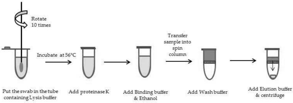 To demonstrate the reliability of such methodology for the genotyping of newborns, both EDTA-blood samplings and buccal swabs from thrombocytopenic newborns were collected in 2012 and 2013. The ethical approval of parents was obtained for all samples included in the study. Two distinct methods have been evaluated. The first method was manual, based on DNA extraction with the QIAamp mini blood kit (Qiagen, Courtaboeuf, France; Figure 1). The manufacturers’ instructions were followed except for a slight modification of a longer swab pre-incubation in 400 µL PBS (overnight instead of a 10 min preincubation at 56 °C), which allows testing samples collected a few days before delivery in our laboratory. The second method was an automated one (MagNA Pure Compact instrument, Roche) based on the MagNA Pure Compact Nucleic Acid Kit I. The methodology is as follows: (1) a first incubation of the buccal swab in 500 µL PBS over 30 min at 56 °C after a vortex of 15 s (2 mL microtube); (2) centrifugation of the microtube 1 min at 600 g to collect as much volume as possible; (3) DNA extraction by the MagNA Pure Compact instrument (protocol: “Total_NA_Plasma_100_400”; sample volume of 400 µL; elution volume of 50 µL). DNA was quantified using Qubit technology (Thermoscientific, Villebon sur Yvette, France). Both DNA extracted from buccal swabs and from blood samplings were genotyped using BioArray technology (HPA BeadChip, Immucor).