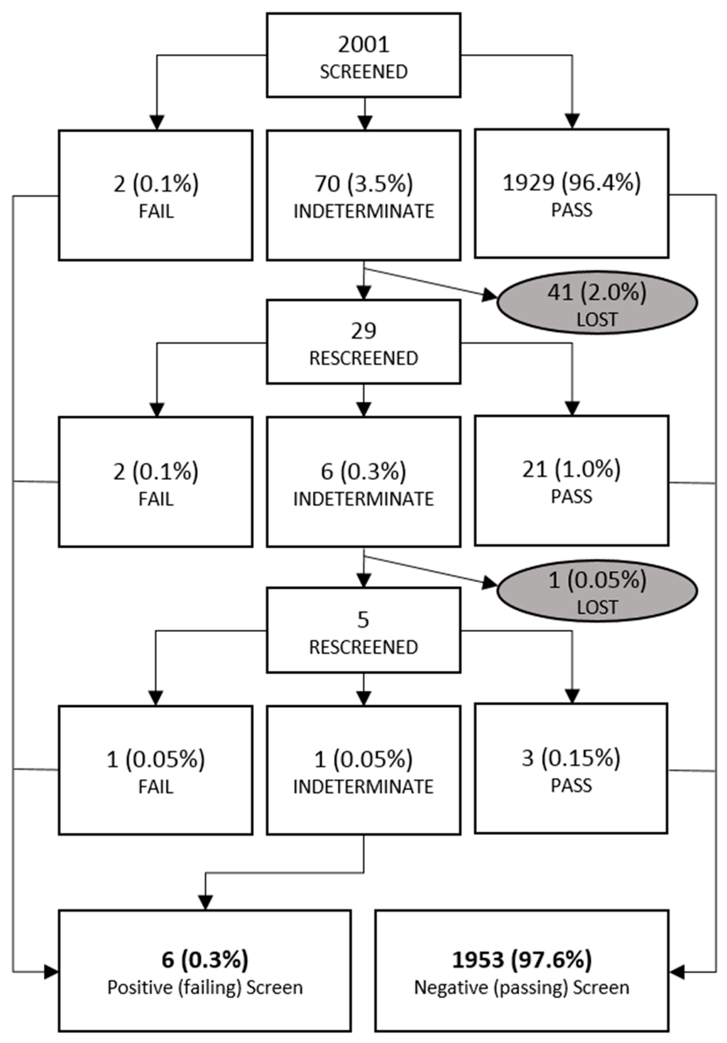 Of the 2001 newborns who underwent screening, 1953 (97.6% with a 95% CI (96.9%, 98.3%)) passed and six (0.3% with a 95% CI (0.01%, 0.5%)) failed screening. This failure rate of 0.3% is statistically different from the failure rate of 1.1% found by Wright et al. (
